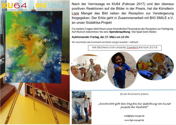März 2017: Dank der Künstlerin Ligia Mangel bekamen wir ein Kunstwerk, welches wir für den Guten Zweck versteigern durften. Für 250,- Euro wechselte das Bild seinen Besitzer, womit BIG SMILE e.V. Smile-Packages finanzieren konnte.